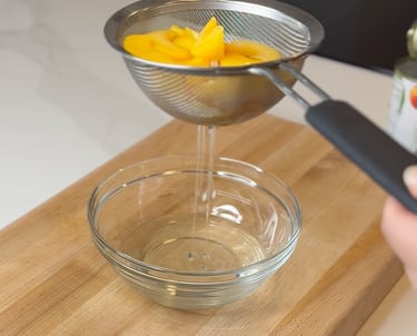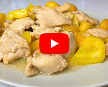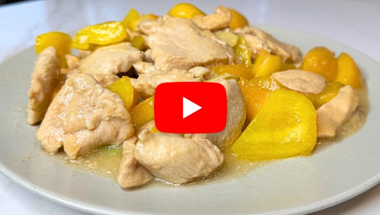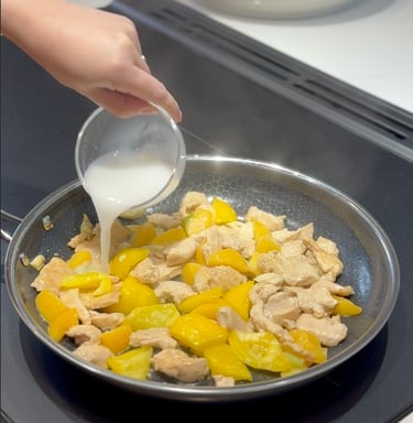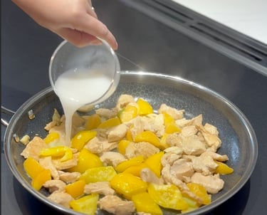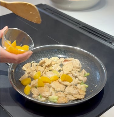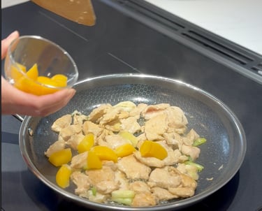 Pour in the peaches and bell pepper. Keep stirring until chicken is fully cooked.