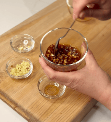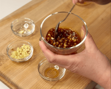 Mince garlic and ginger. Mix oyster sauce, soy, fish sauce, sugar, ginger and garlic well together.