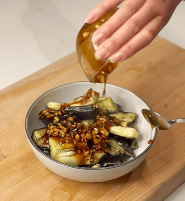 Add the sauce to the eggplant and mix well. Optional: sprinkle of sesame seeds.