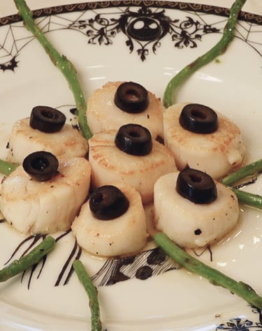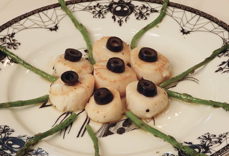 Spooky Eye Balls with Witch Fingers (Scallops with Asparagus)