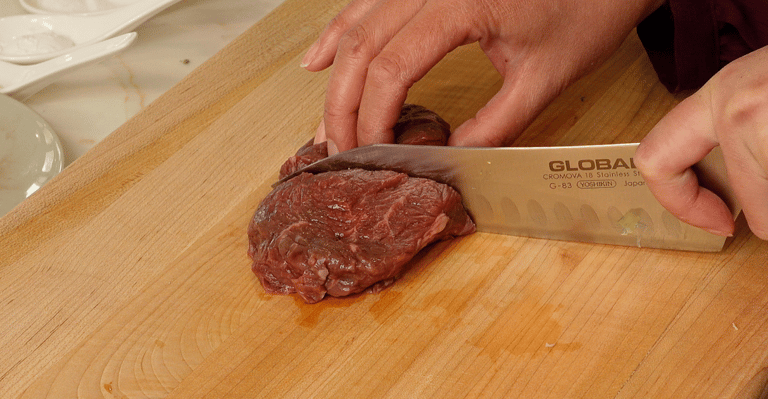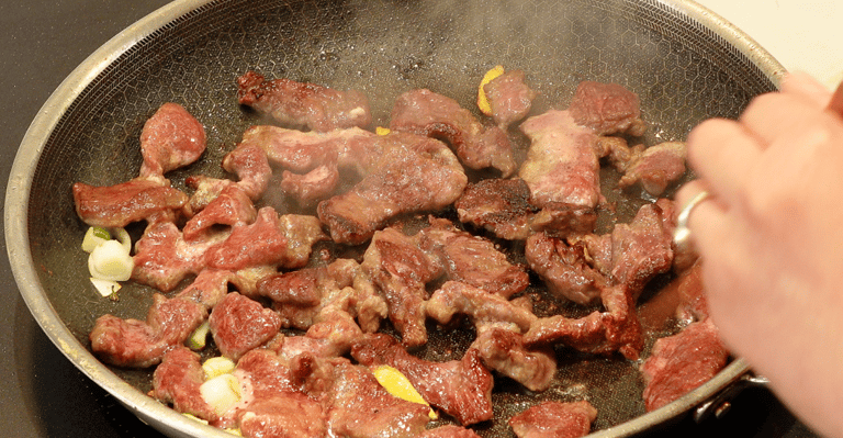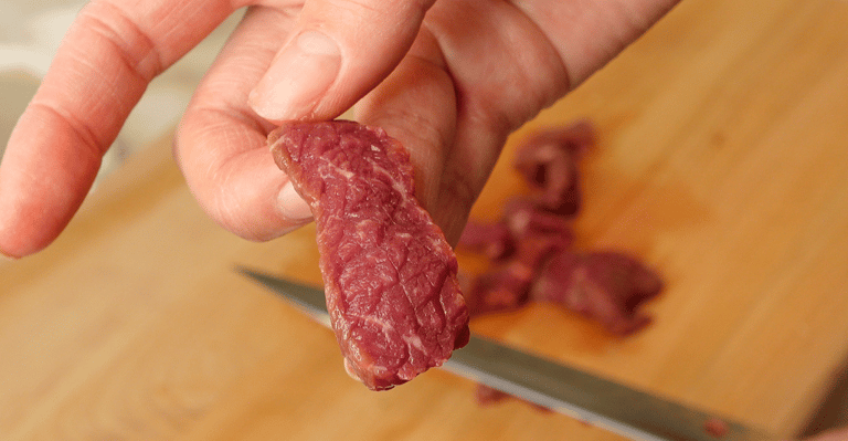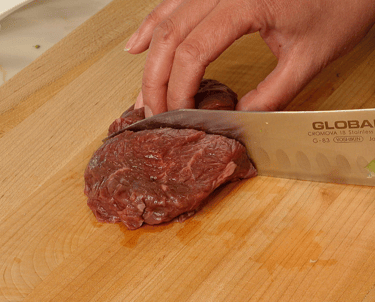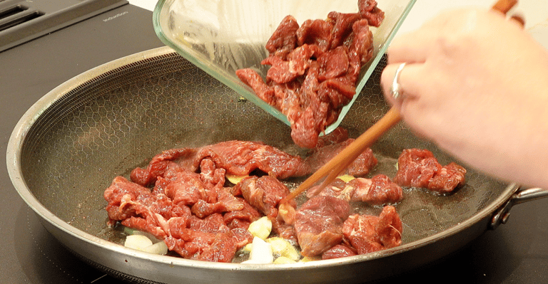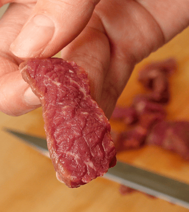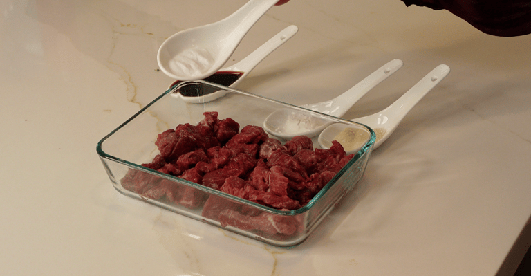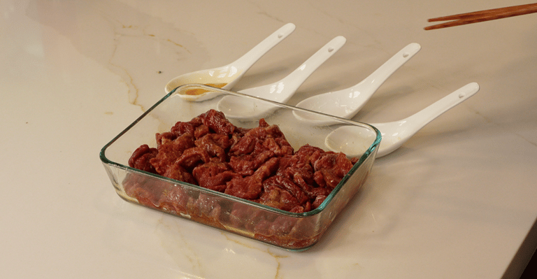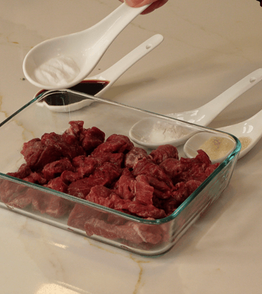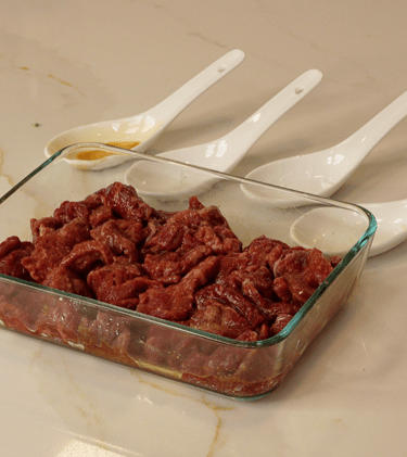 Slice beef into 1/4 inch pieces and cut through the grain. Marinate with seasonings for at least 20 minutes.