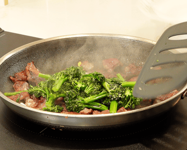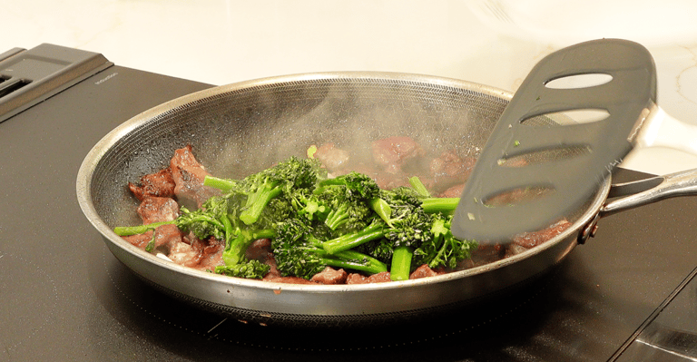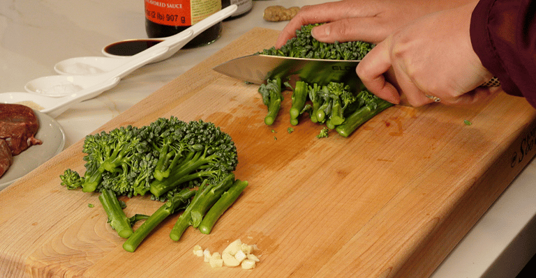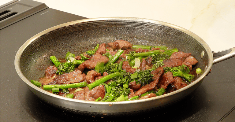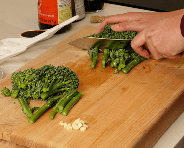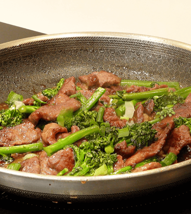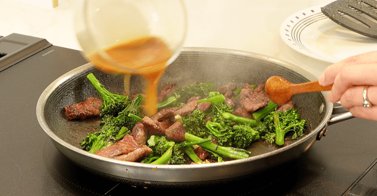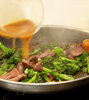 Add the broccolini to the beef, pour the sauce mixture into the wok and continue to stir-fry until the sauce thickens. Serve immediately.