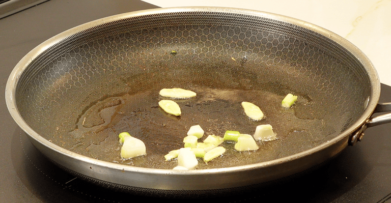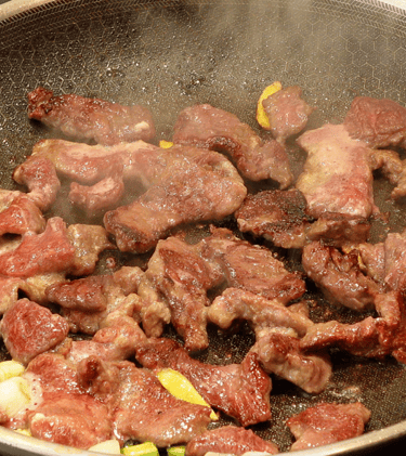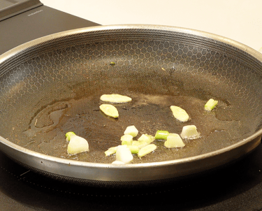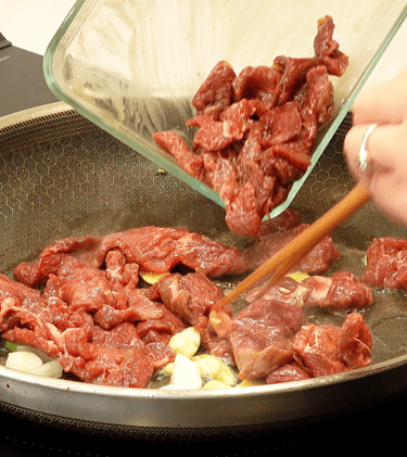 Heat 1½ tbsp of oil in a wok in HIGH HEAT. Stir-fry the ginger, minced garlic, and green onions until fragrant. Add the marinated beef and stir-fry for a few moments. Add the cooking wine and stir.