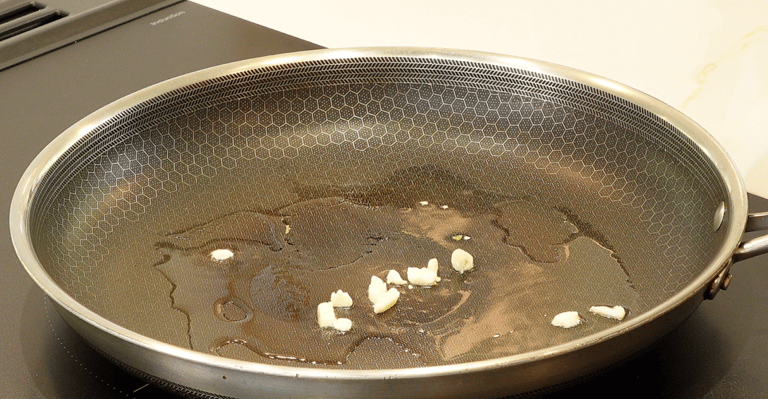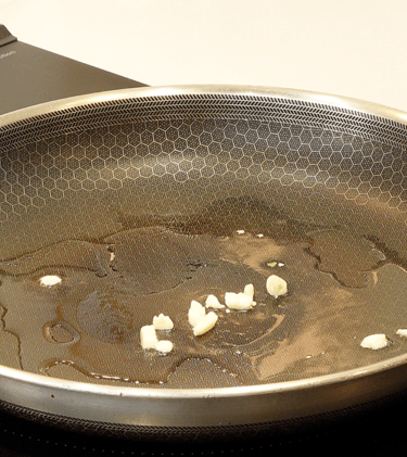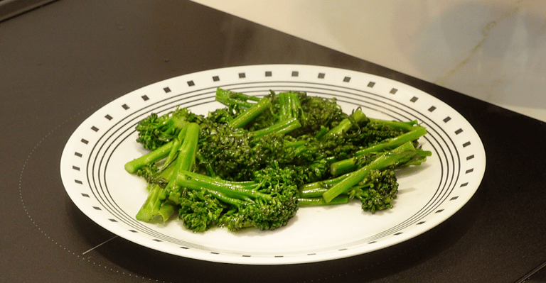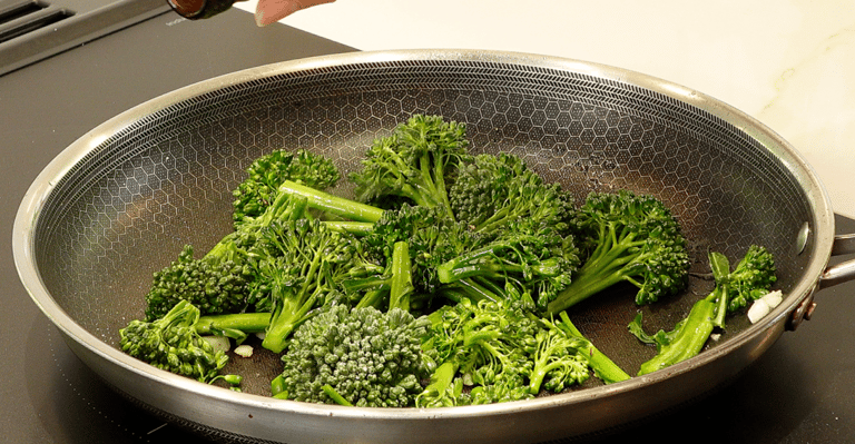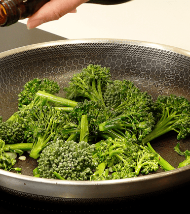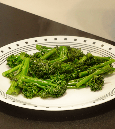 Wash the broccolini and cut it into 3-4 inch sections. Add garlic to 1 tbsp of oil in a pan and cook broccolini until fully cooked, add a pinch of salt. Set aside.